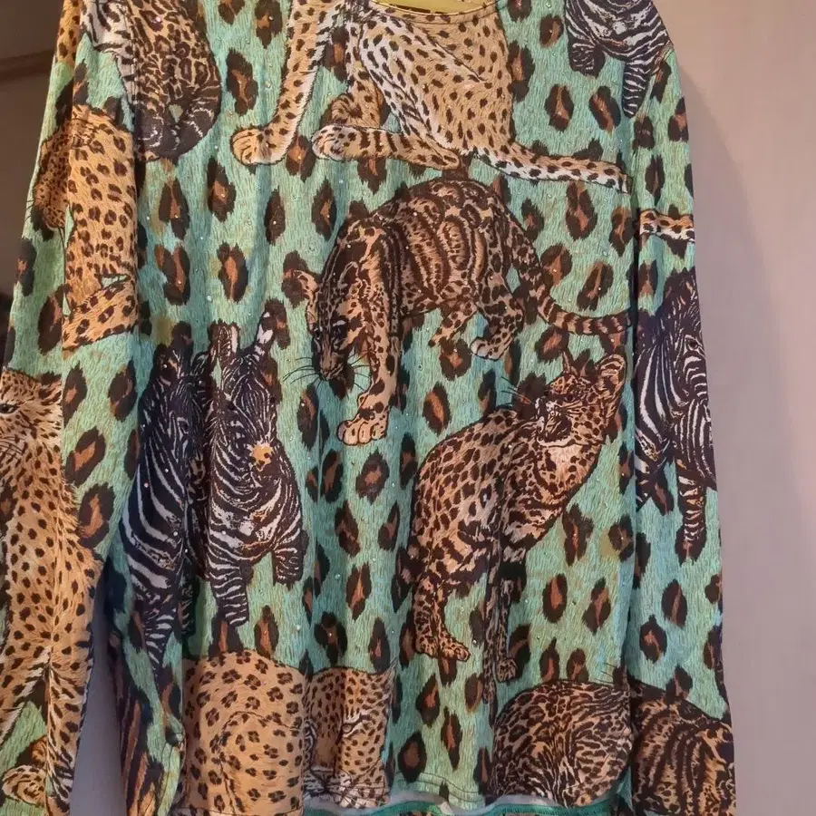 레오파드와 호랑이 프린트가 특징인 민트 그린 색상의 긴팔 상의. - 디자인: 레오파드 무늬와 호랑이 무늬 프린트 - 색상: 민트 그린 - 소재: 불명이나 부드러워 보임 - 장식: 비즈 장식 있음 방문해 주셔서 감사합니다.