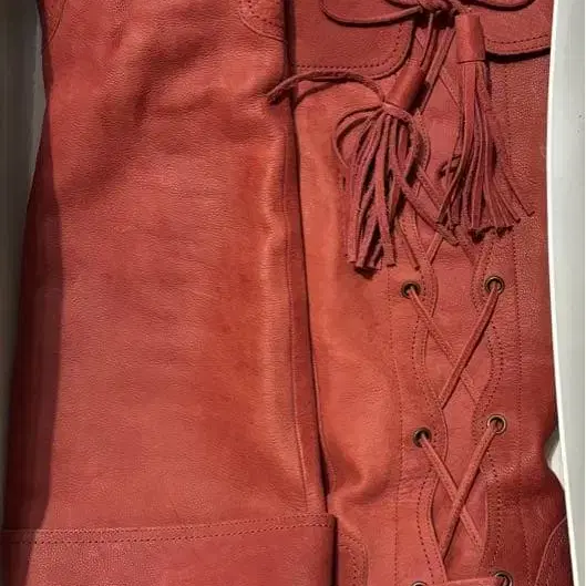 레이스업 디자인의 빨간색 가죽 롱 부츠, 높은 힐로 스타일리시합니다.