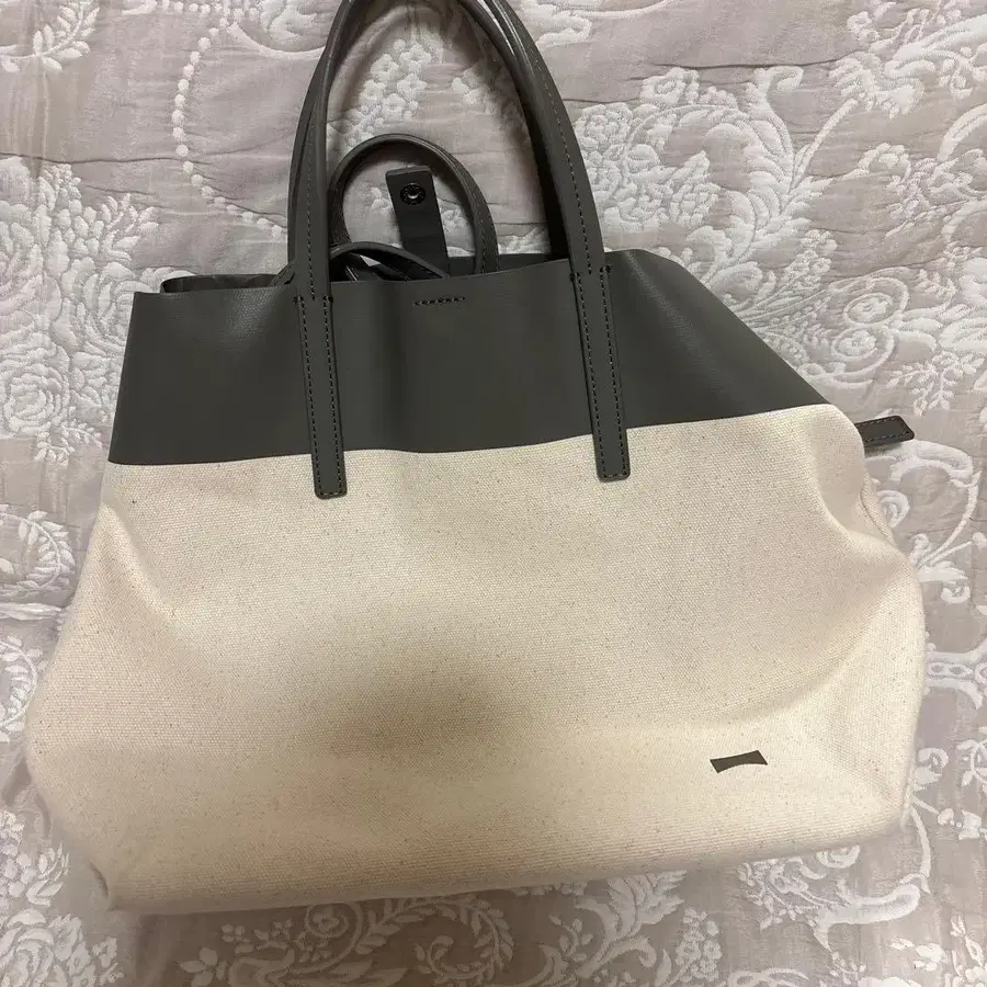 그레이와 베이지 색상의 캔버스 소재 토트백입니다. 탈부착 가능한 숄더 스트랩이 있으며, 내부 포켓도 갖추고 있습니다.