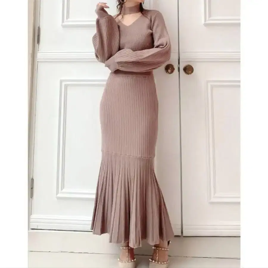 신체 라인에 핏되는 롱 실루엣이 성숙하고 등에는 리본, 봉긋한 소매와 귀여움이 담긴 1장입니다.