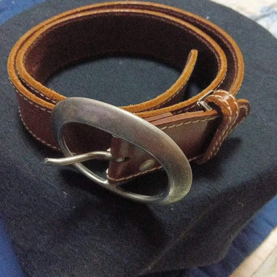 브라운 가죽 오벌 버클 벨트, 약 3.5cm 폭, 화이트 스티치 마감.
