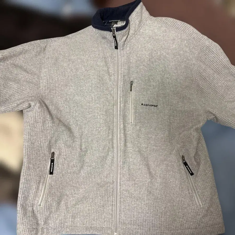플리스 소재의 집업 자켓, 그레이 색상으로 양쪽 사이드 포켓이 있습니다.