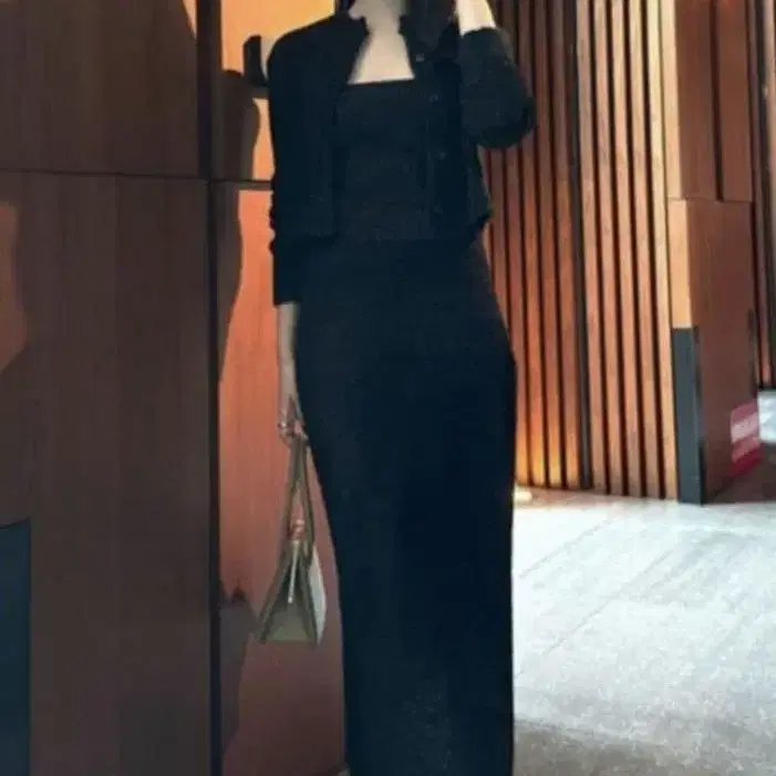 심플하고 엘레강트한 anuans의 라메 니트 셋업 가디건 이너 스커트 세트입니다 - 착용 모델: 157cm - 컬러: 블랙 - 사이즈: F 이곳에서 양도받았습니다
