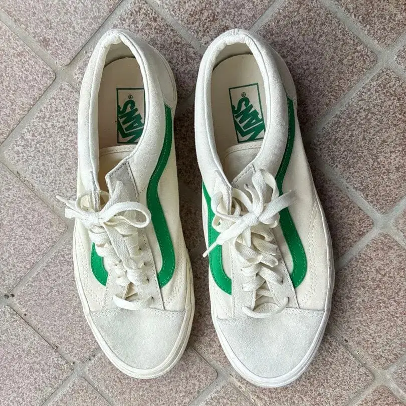 화이트와 그린 색상의 캔버스 스니커즈, VANS 로고 포함. - 브랜드: VANS - 색상: 화이트/그린 - 스타일: 스니커즈 - 디자인: 로고 포함 - 소재: 캔버스 방문해 주셔서 감사합니다. 사이즈 - 28cm