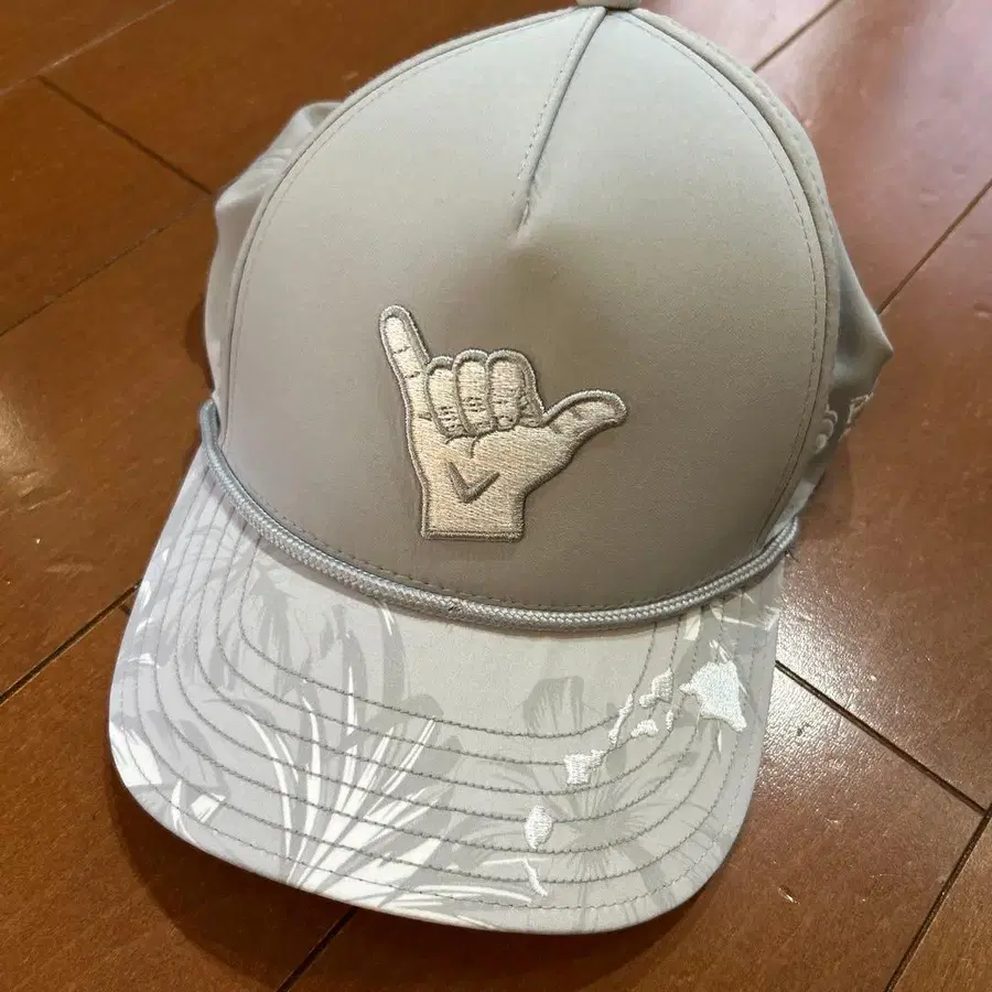 그레이 색상의 Callaway 캡, 심플한 로고와 통기 구멍이 있는 디자인.