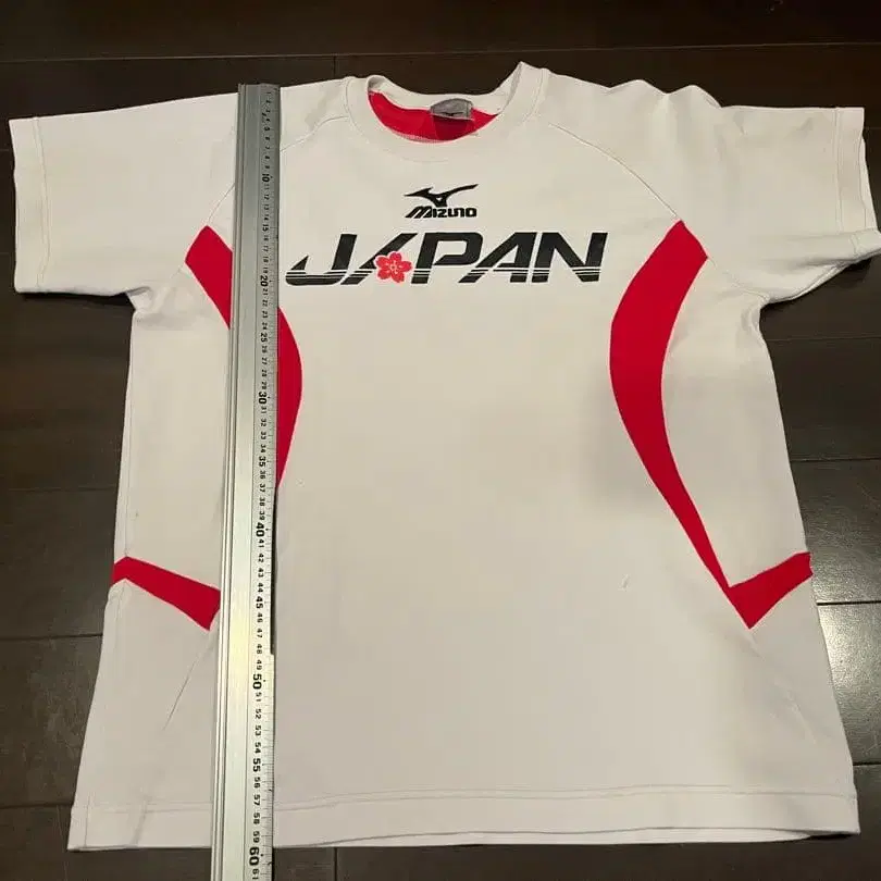 일본 대표 수영 Mizuno제 화이트와 레드 색상의 반팔 T셔츠, JAPAN 로고 포함.