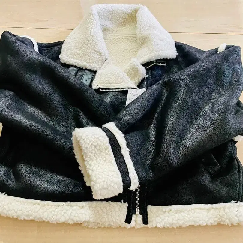 블랙과 화이트 보아 카라 부착 숏 무스탕 코트, 라이더 스타일로 멋스러운 인상.