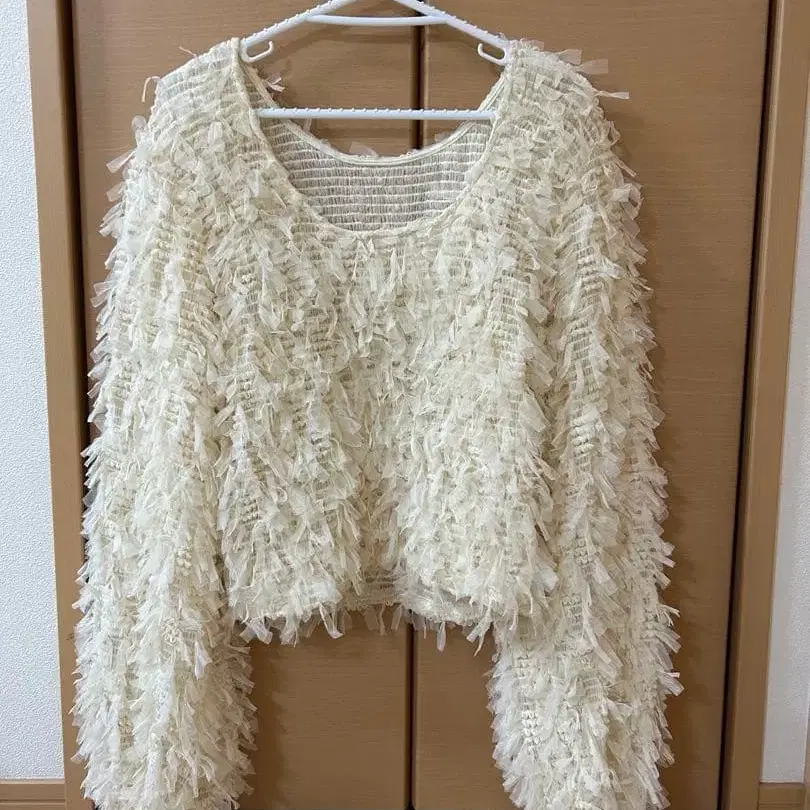 아이보리 색상의 프릴 디자인 긴팔 상의, 메쉬 소재로 가볍습니다. 가슴 너비 46, 기장 50 ㊴ - 색상: 아이보리 - 디자인: 프릴 디자인 - 소재: 메쉬 소재 방문해 주셔서 감사합니다. 사이즈 - FREE SIZE