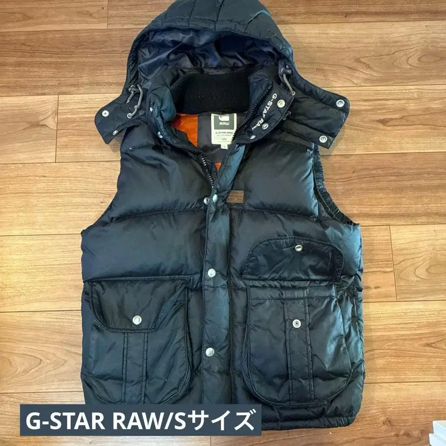 탈부착 가능한 후드 부착 블랙 다운 베스트이며, 오렌지 안감이 특징입니다.