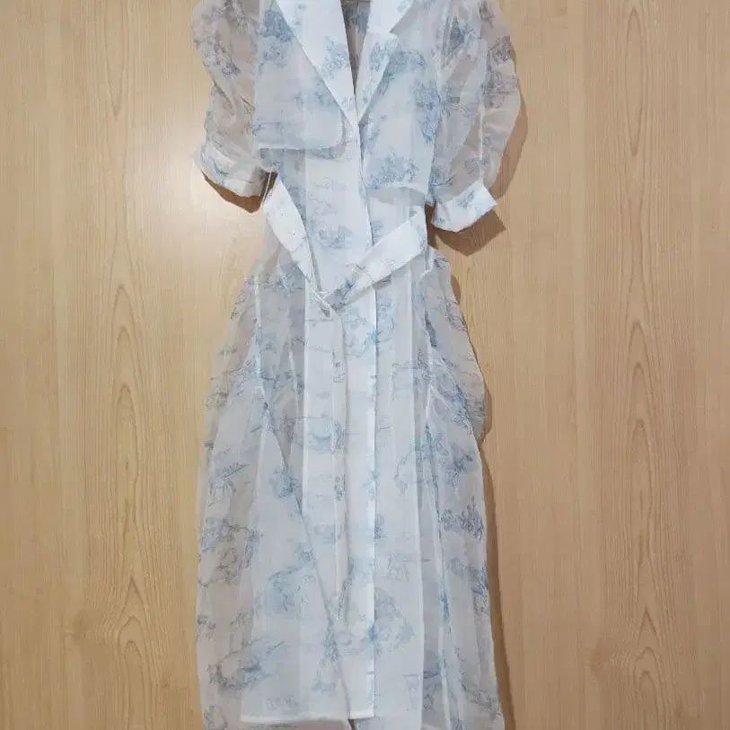 시스루 소재의 화이트 블루 롱 가디건, 퍼프 슬리브와 허리 벨트 포함.