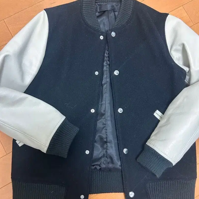 바시티 자켓 스타일의 블랙/그레이 자켓, 사이즈 38, 폴리에스테르와 cow 가죽 - 색상: 블랙/그레이 - 사이즈: 38 - 소재: 폴리에스테르, cow 가죽 소매 부분 얼룩 있음 - 디자인: 바시티 자켓 스타일 - 안쪽 소재: 새틴 마감 방문해 주셔서 감사합니다.