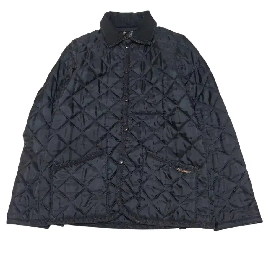 퀼팅 디자인의 블랙 자켓, 코듀로이 옷깃과 프론트 포켓 부착.