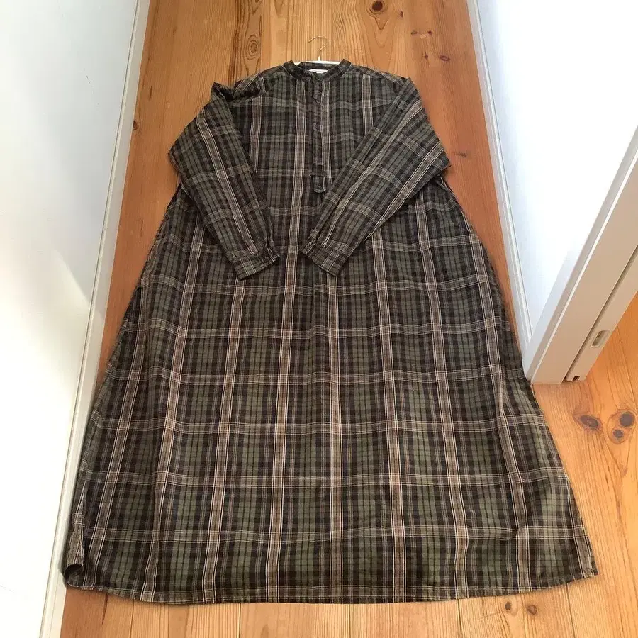 그랑ママ도터 코튼 밴드 카라 원피스 브라운 계열 체크 소매는 밴딩 처리되어 사용하기 편리합니다. 양쪽 사이드 포켓 있음. 어깨 너비 51cm 가슴 너비 58cm 소매 길이 49cm 총길이 118cm