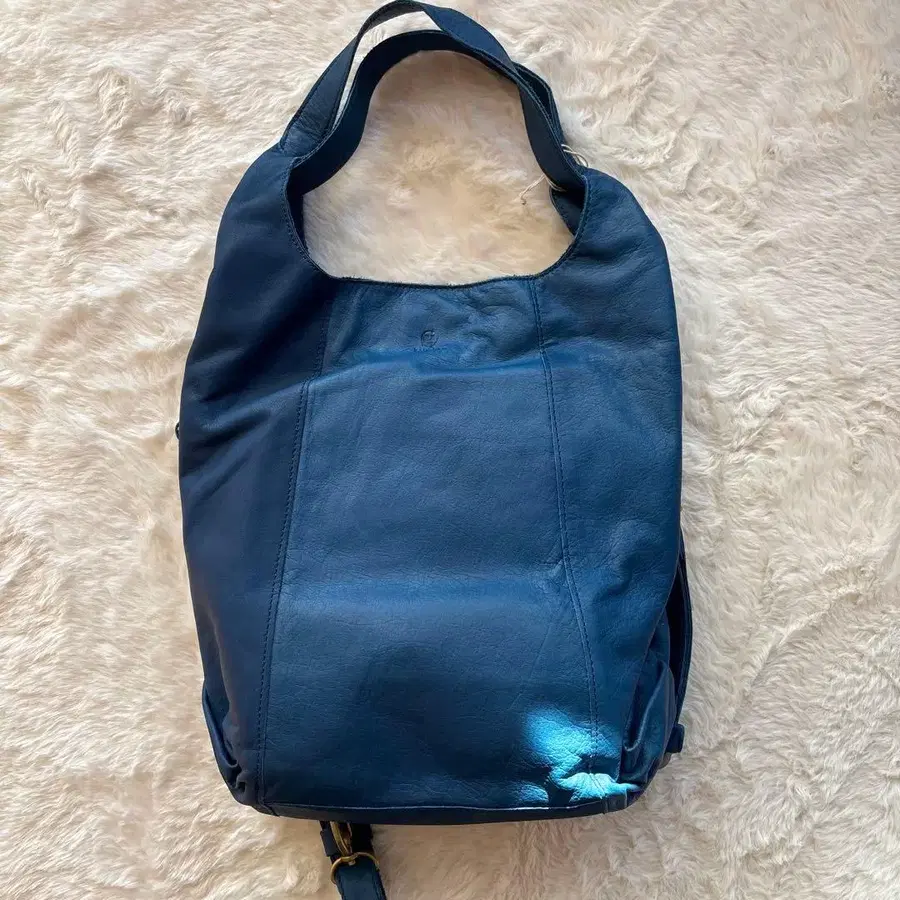 키소라 2way 백 숄더 백팩 안쪽에 앞뒤로 2개의 포켓이 있습니다. 사이드에 지퍼 달린 포켓이 있습니다. 컬러 - 블루 소재 - 천연 가죽