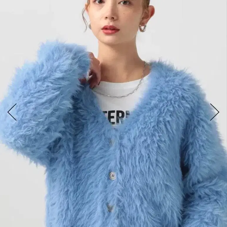 부드러운 숏 샤기 소재의 라이트 블루 가디건, 캐주얼 스타일에 최적입니다.