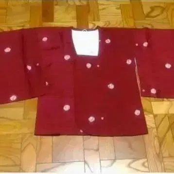 빨간 꽃 무늬 기모노, 물결 무늬 안감 부착.