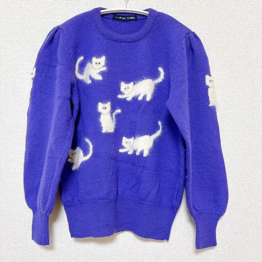 자동 번역되었어요. 원문보기고양이 패턴이 특징인 보라색 긴팔 니트 스웨터.