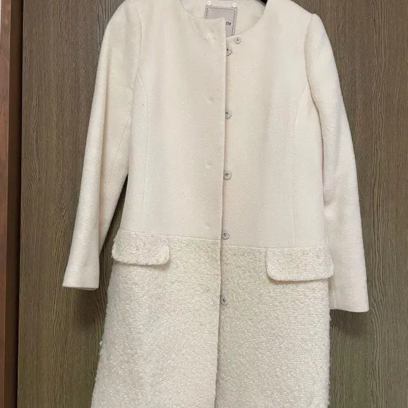 다른 소재 믹스의 아이보리 울 혼방 롱 코트, 비쥬가 달린 브로치 포함.