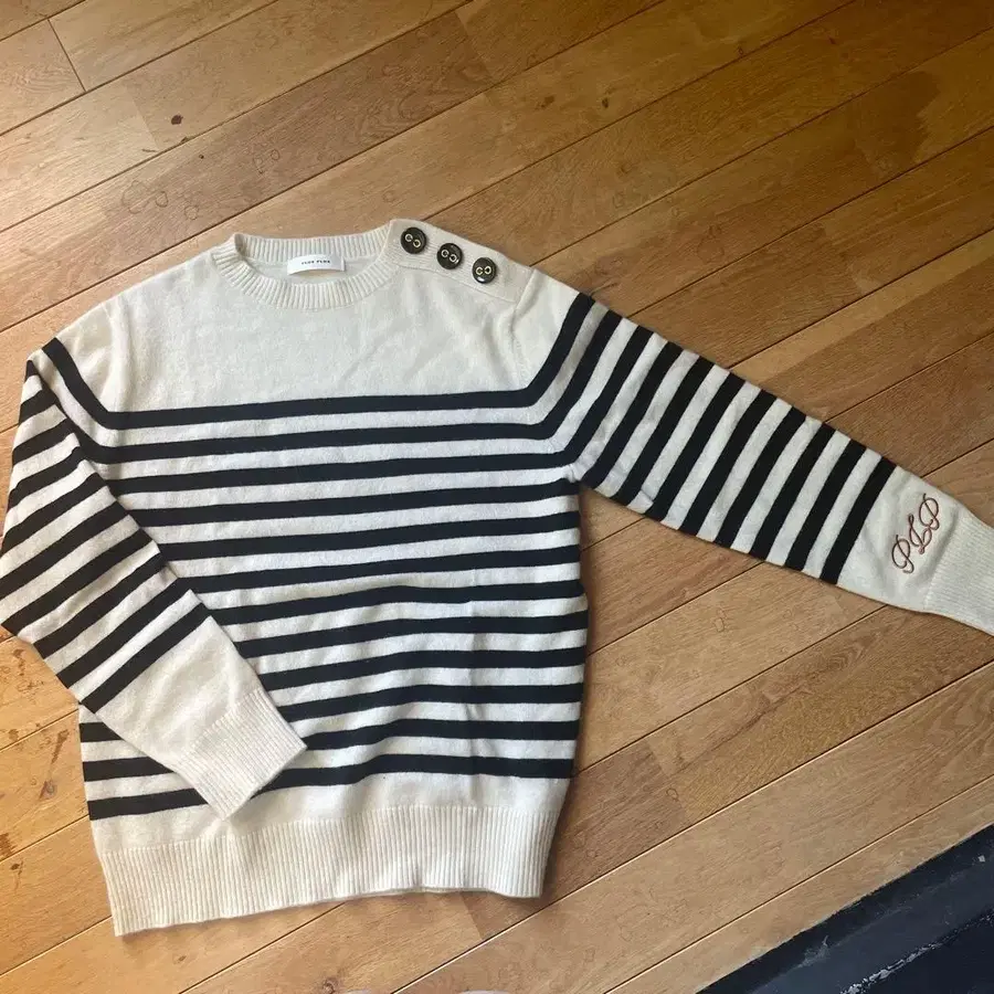 아이보리와 네이비 보더 스트라이프 디자인, 어깨의 버튼이 악센트인 긴팔 캐시미어 니트 스웨터.