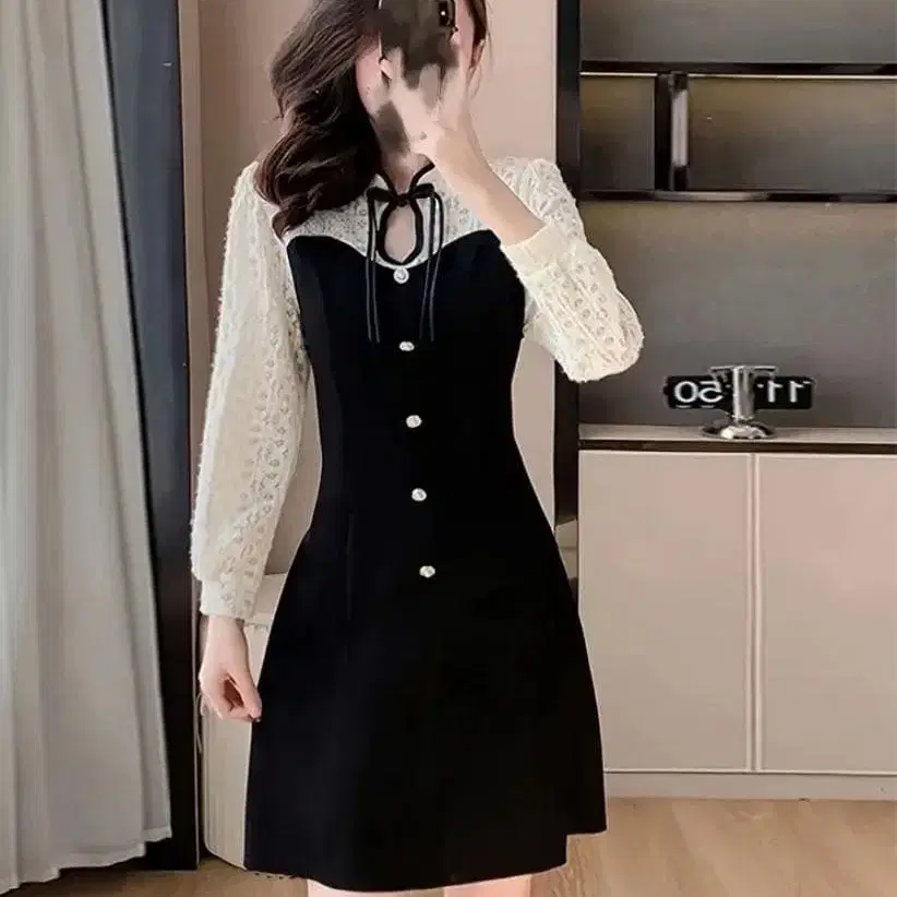 긴팔 레이스 소재와 A라인 실루엣이 특징인 미니 원피스. - 색상: 블랙 - 사이즈: M - 디자인: 긴팔, 7부 소매, 레이스 소재 소매, 버튼 포함 - 스타일: A라인 실루엣, 프론트 리본 포함 방문해 주셔서 감사합니다.