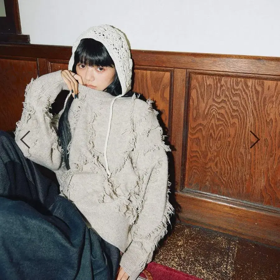 프린지의 존재감에 더해, 실의 농담이 만들어내는 멜란지 컬러가 절묘하게 조화를 이루는 성인용 니트.
