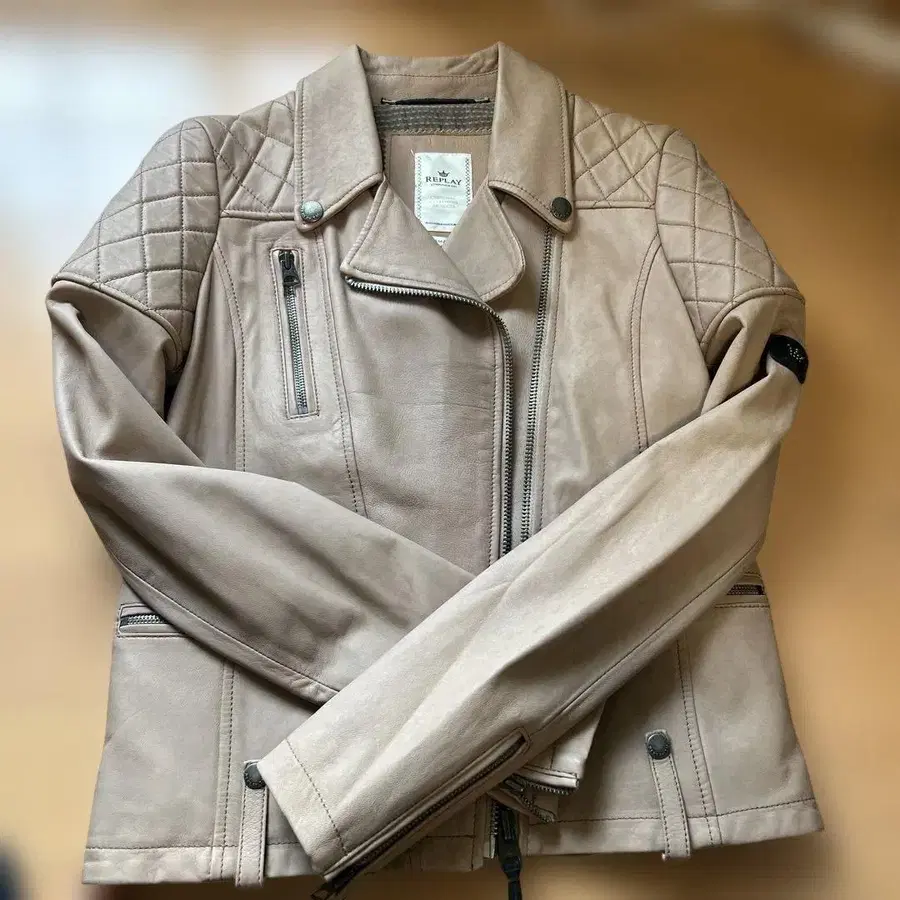 퀼팅 디자인의 베이지 가죽 자켓, 사이즈 S.