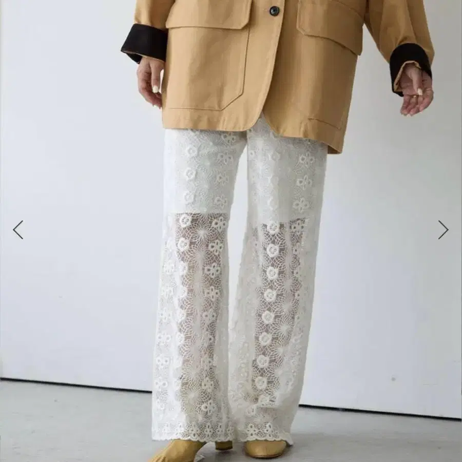 시어한 느낌과 지오메트릭한 플라워 무늬가 럭셔리한 분위기의 레이스 팬츠.