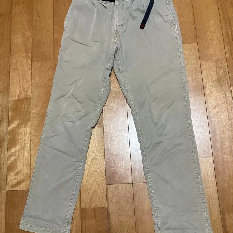 조정 가능한 벨트가 달린 베이지 치노 팬츠.