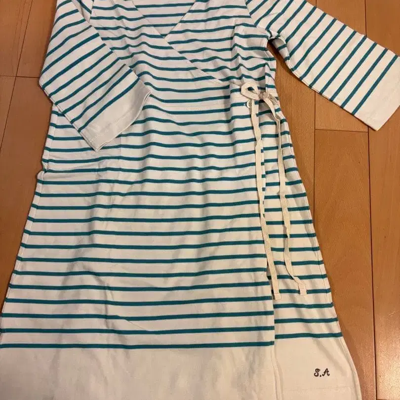 민트 그린과 화이트 보더의 랩 카슈쿨 원피스, 허리 리본 포함, 7부 소매 디자인. - 색상: 민트 그린과 화이트 보더 - 소매 길이: 7부 소매 - 디자인: 랩 카슈쿨 스타일. 밑단 왼쪽에 SA 자수 - 사이즈: 기장 91cm - 특징: 허리 리본 (버튼) 포함. 밑단 슬릿 있음. 방문해 주셔서 감사합니다.
