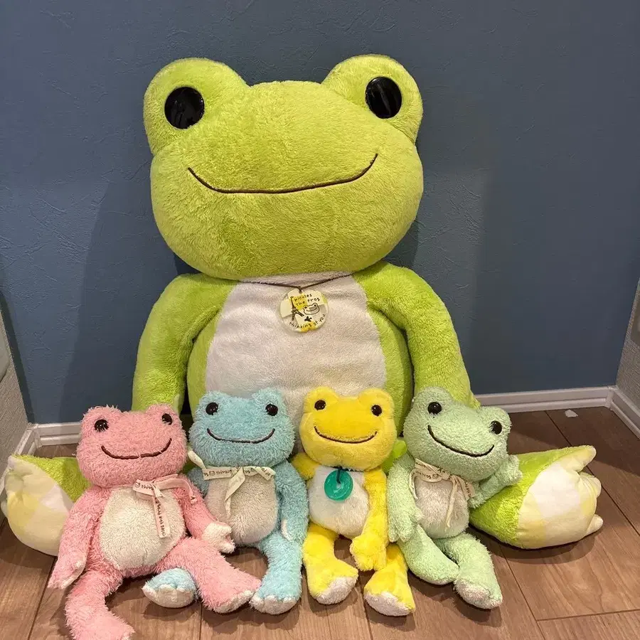 개구리 피클스 봉제 인형 5체 세트, 부드러운 소재와 웃는 디자인. 정품입니다. 공식 샵에서의 구매입니다. 가장 큰 봉제 인형은 세로 약 50cm, 가로 약 30cm입니다. 중고품이므로 양해해 주시는 분만 구매 부탁드립니다.