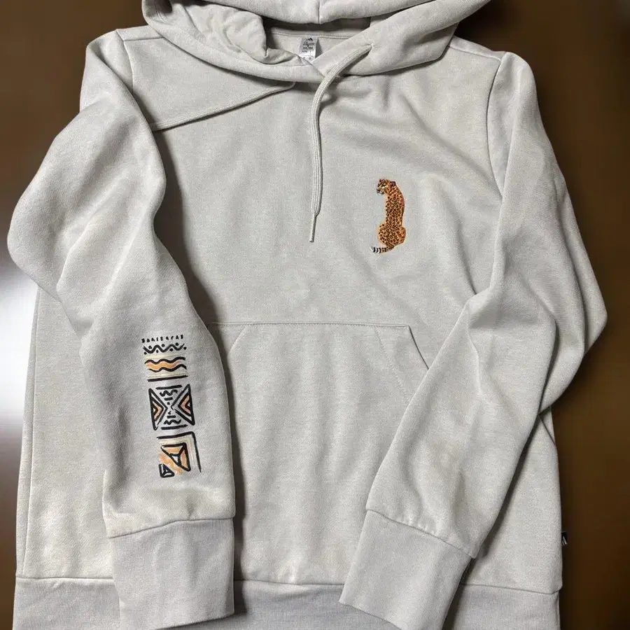 레오파드 자수와 그래픽 프린트가 특징인 크림색 후드티. - 색상: 크림색 - 디자인: 레오파드 자수 - 소매 디자인: 그래픽 프린트 - 후드: 후드 부착 - 포켓: 캥거루 포켓 방문해 주셔서 감사합니다. 사이즈 - L이지만, 신축성은 별로 없고 M에 가까운 사이즈감입니다.