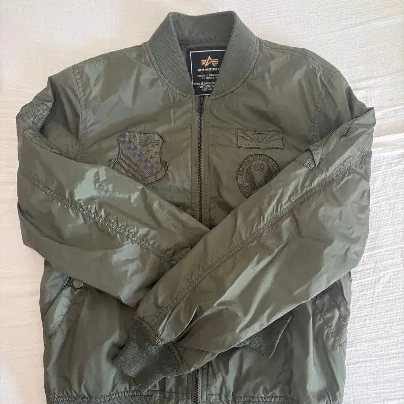 올리브 그린 플라이트 자켓, 패치 포함, ALPHA INDUSTRIES 브랜드 M 사이즈.