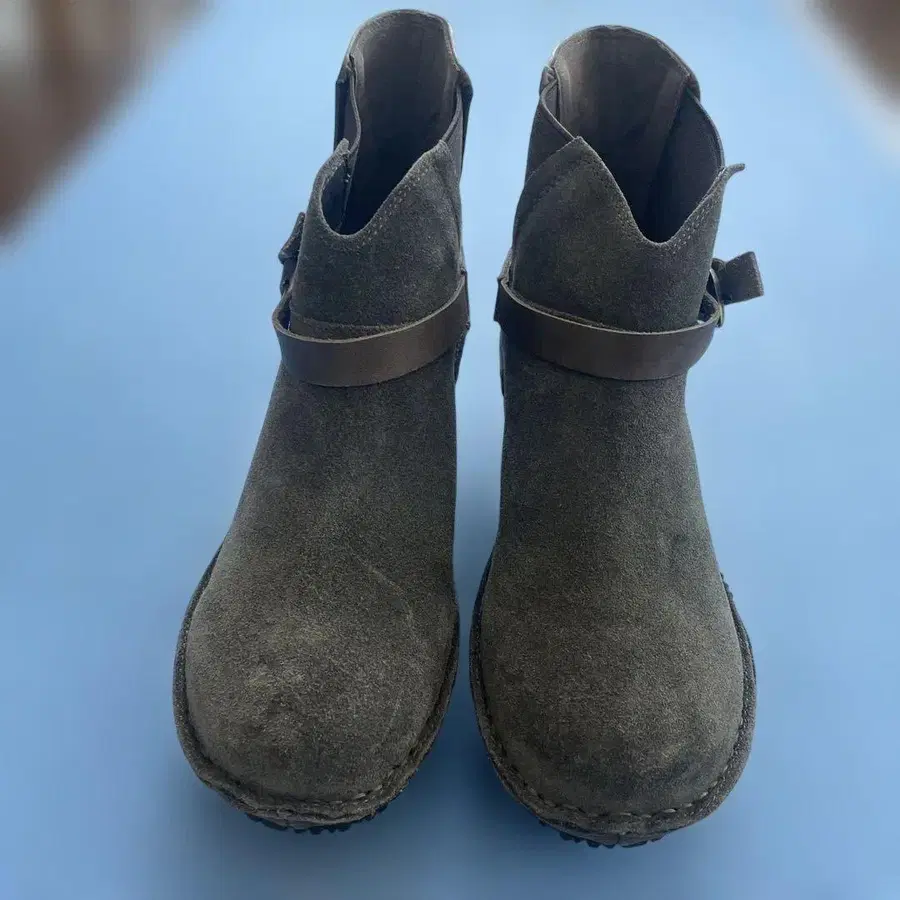 스웨이드 소재의 그레이 웨지힐 부츠, 백 스트랩이 있어 캐주얼 스타일에 최적.