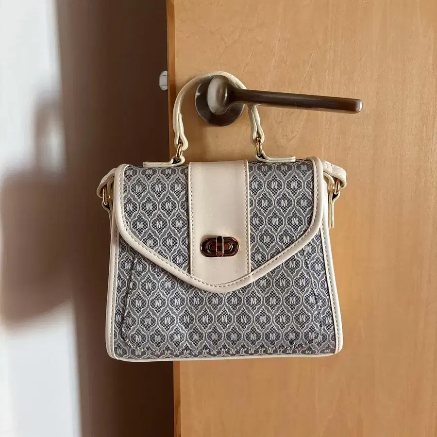 MOUSSY (마우지)의 M 로고가 새겨진 연한 블루와 화이트 색상의 핸드백. 숄더백