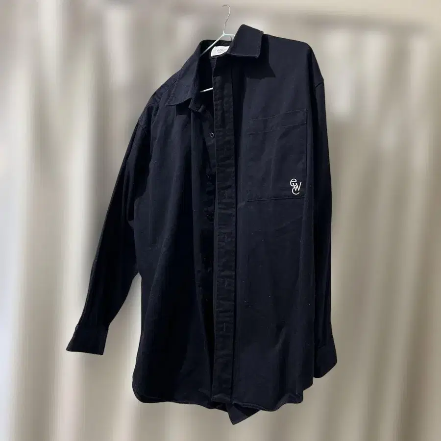 심플하고 스타일리시한 블랙 긴팔 셔츠, 앞면에 포켓 부착.