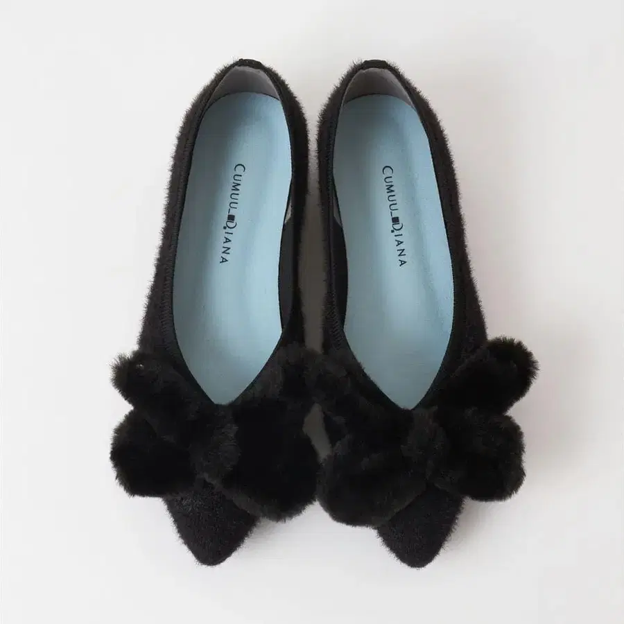 퍼가 달린 블랙 플랫슈즈, 보풀 소재로 쾌적한 착용감. - 브랜드: CUMULU DIANA - 색상: 블랙 - 디자인: 퍼가 달린 플랫슈즈 - 소재: 보풀 소재 - 부속품: 박스형 색상 - 블랙 계열