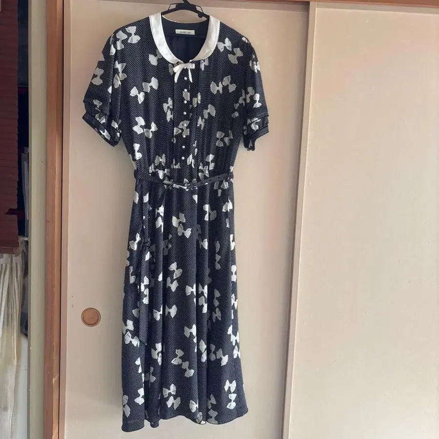 블랙 베이스에 화이트 리본 디자인의 반팔 롱 원피스 - 디자인: 블랙 베이스에 화이트 리본 디자인 - 옷깃 디자인: 화이트 카라 부착 - 소매 디자인: 반팔 - 버튼: 앞면에 버튼 부착 방문해 주셔서 감사합니다. 사이즈 - FREE SIZE
