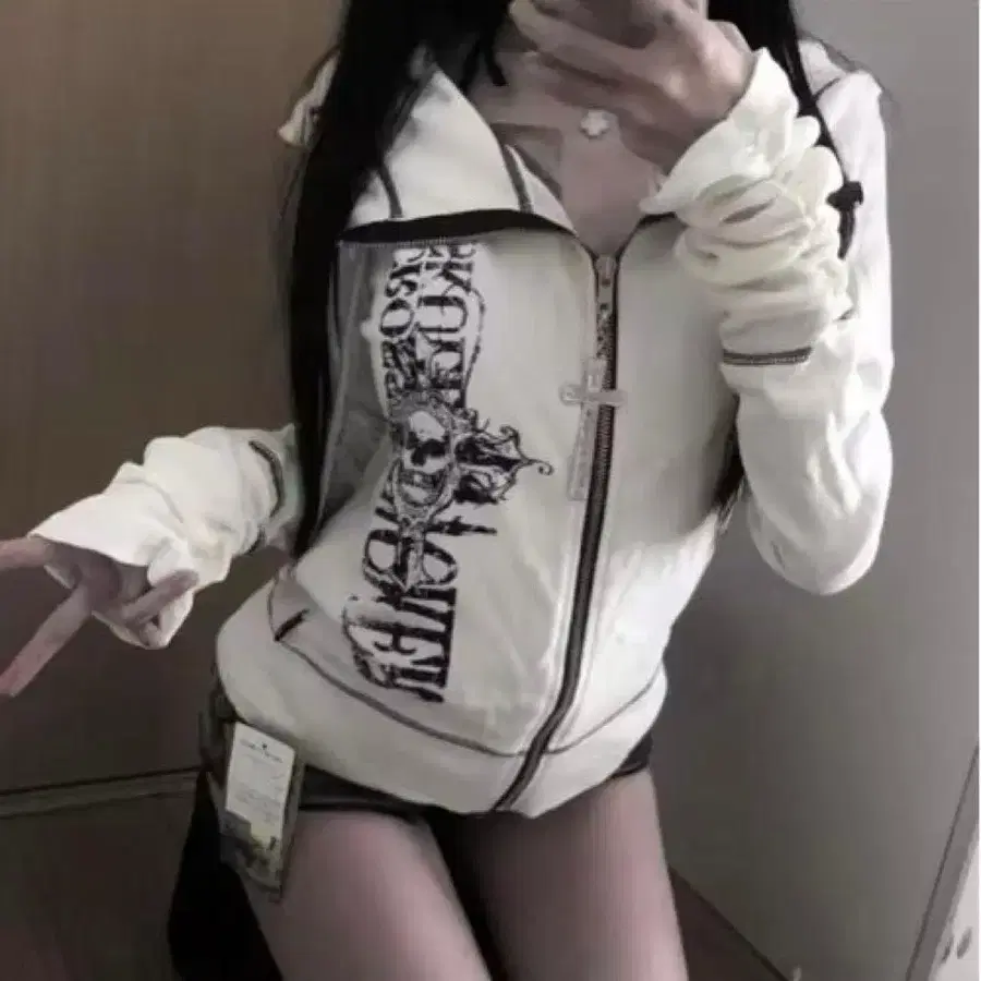 스컬 프린트가 들어간 화이트 집업 후드티입니다. 프릴이 달린 소매로 개성 있는 디자인입니다.