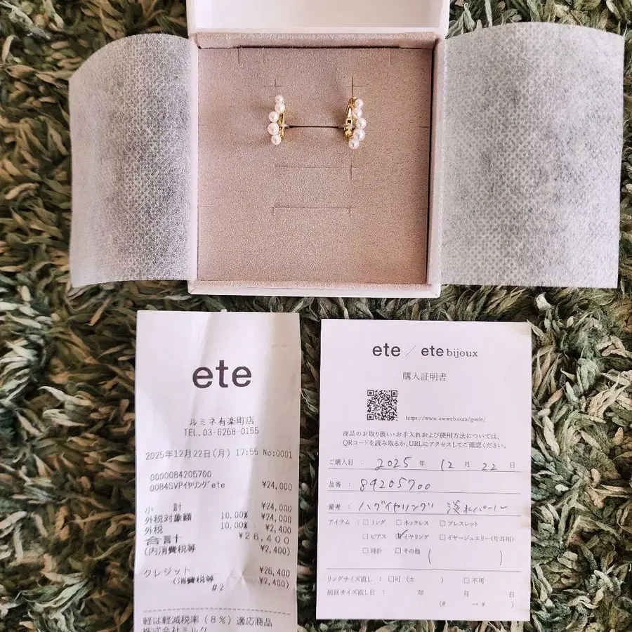 ete의 펄 귀찌입니다. 첨부된 사진의 영수증과 같이, 직영점에서 2025년 12월 22일에 구매하였으나 불필요하게 되어 판매하게 되었습니다. 미사용 새상품으로 판매합니다. 부속품으로, 직영점 구매 인증서, 영수증, 상자, 쇼핑백을 함께 드립니다.