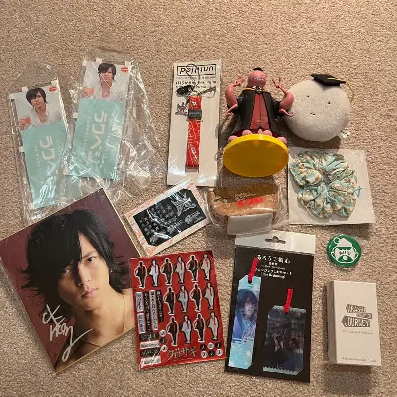다채로운 연예인 굿즈 세트. 사인 포함 사진, 피규어, 배지 등이 포함되어 있습니다.