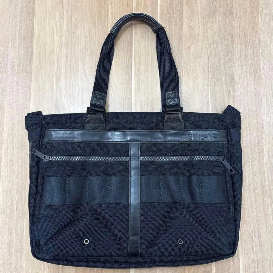 나일론과 가죽의 콤비네이션으로, 외부에 지퍼 포켓이 달린 숄더 가능한 토트백.