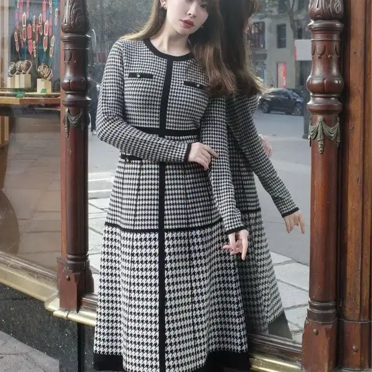 하운드투스 체크 니트 원피스 착용 횟수 1회 - 색상: 블랙 화이트 - 스타일: 긴팔 롱 기장 - 소재: 니트 방문해 주셔서 감사합니다. 색상 - 블랙 계열 실루엣 - 플레어 계절 - 가을/겨울 얼룩, 찢김, 냄새 등 - 없음