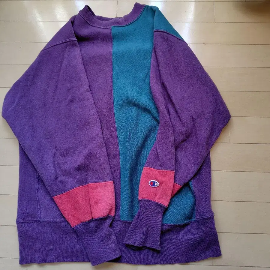 챔피온 맨투맨 컬러 블록 디자인 보라색, 그린, 빨간색 배색 초레어 멋집니다.