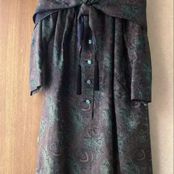 그린, 네이비 계열의 실크 같은 원단이며, 동일 원단으로 만든 숄이 포함되어 있습니다.