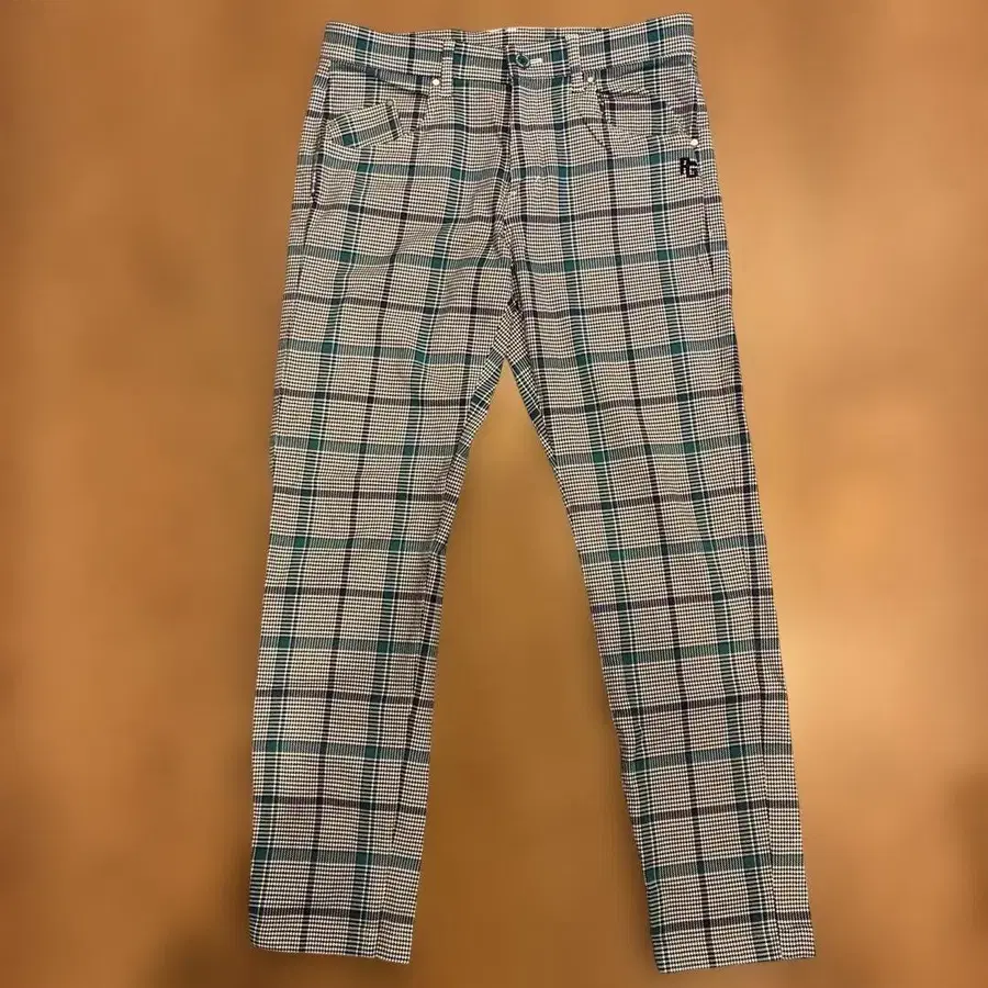체크 무늬 골프 팬츠, PG 로고 포함.