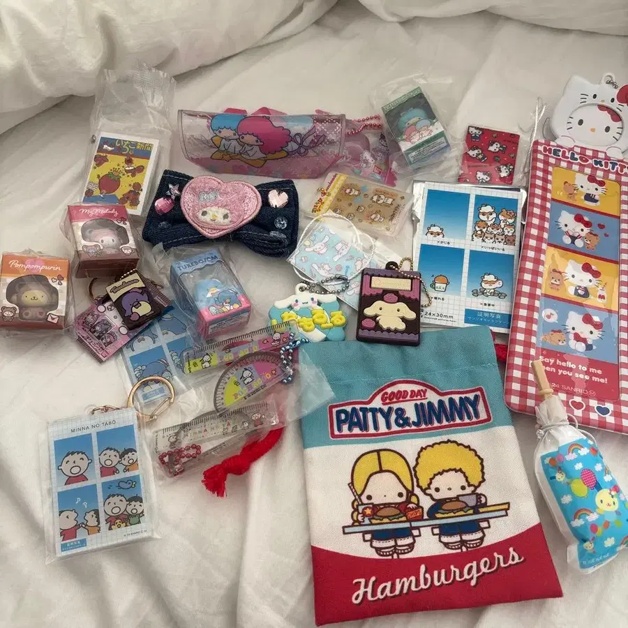 산리오 캐릭터즈 세트입니다. 키티, 마이멜로디, 시나몬, 포차코, 폼폼푸딩, 키키라라, 코로코로쿠리린, 샘, 타아보, 우사하나, 파티&지미 세트입니다. 모두 자택 보관으로 미사용입니다. 낱개 판매 불가.