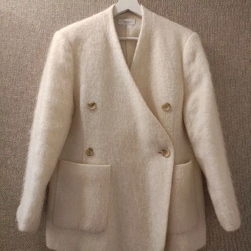 아이보리 색상의 더블 브레스트 노카라 자켓, 프론트 포켓 부착으로 스타일리시합니다.
