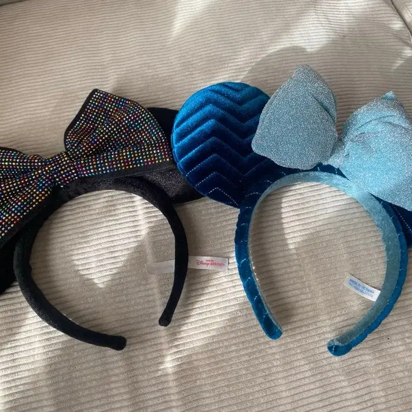 미니 마우스 스타일 머리띠 2개 세트입니다. - 색상: 블랙, 파랑 - 디자인: 리본 포함, 미니 마우스 스타일 - 소재: 벨벳, 글리터 - 특징: 퀼팅 무늬, 광택감 있는 리본