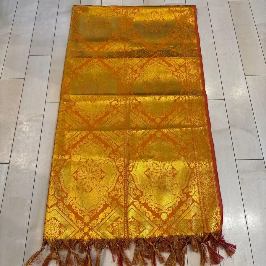 인도에서 받은 선물입니다. 남성 민족 의상이라고 합니다. 고가인 제품이라는 설명이 있었습니다. 천 사이즈 가로 198cm 양쪽 끝 실 부분: 각 10cm 세로 115cm 특징: 꿰매지 않은 한 장의 천 색상 - 골드 계열