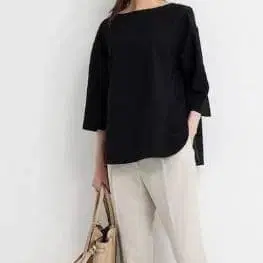 밑단으로 갈수록 여유로운 스트레이트 실루엣. 뒷 요크 아래에 사이드 아웃 턱. 얇은 엣지 스티치를 넣은 보트넥. 스트레이트 슬리브와 드롭 숄더의 둥근 어깨 끝 부분. 소매에 턱을 넣어 입체적인 슬리브 실루엣. 밑단 사이드는 전면부와 후면부를 겹친 디자인.